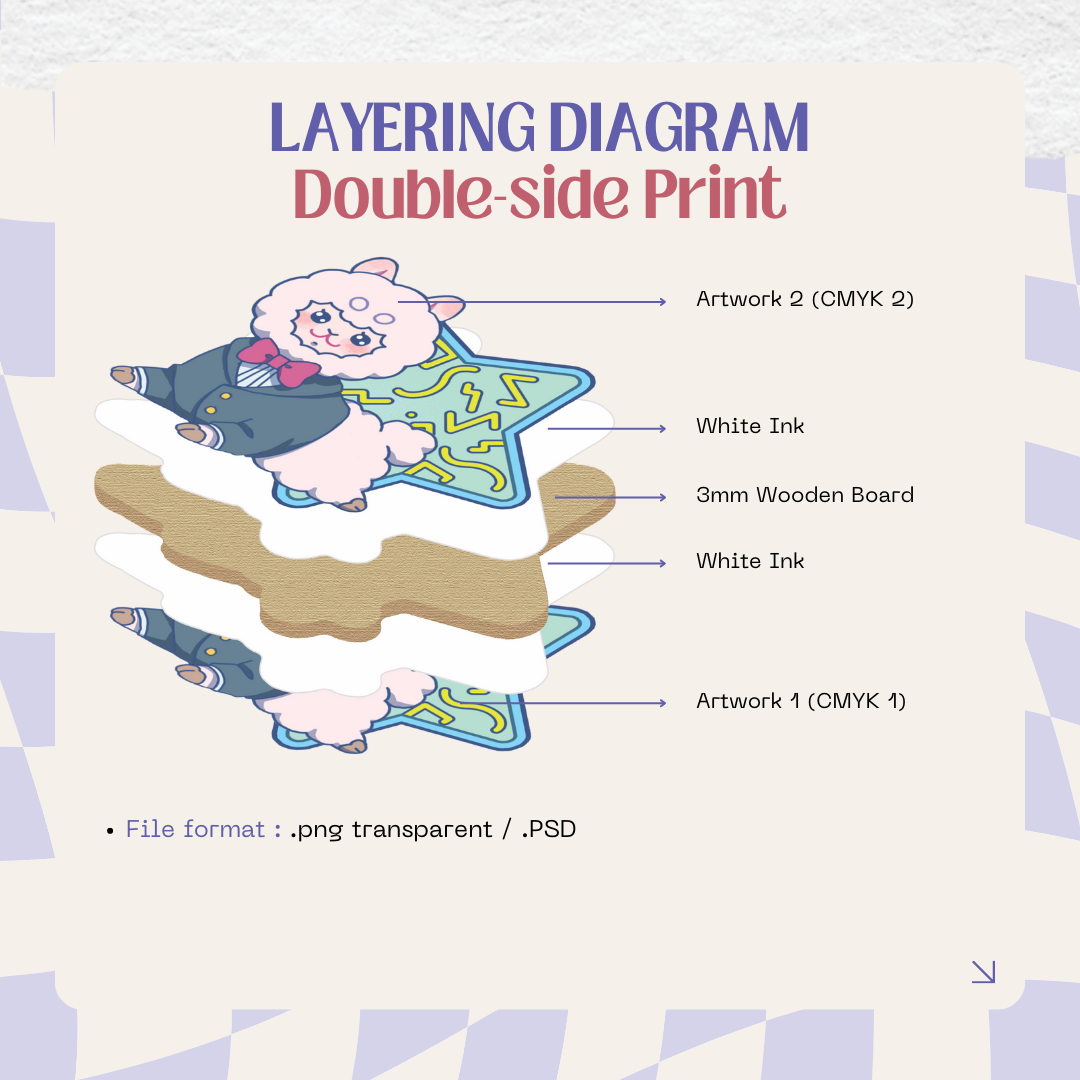 Artwork UV printed in single acrylic board. Double-side print, have matte/ink textured finish on one side.
